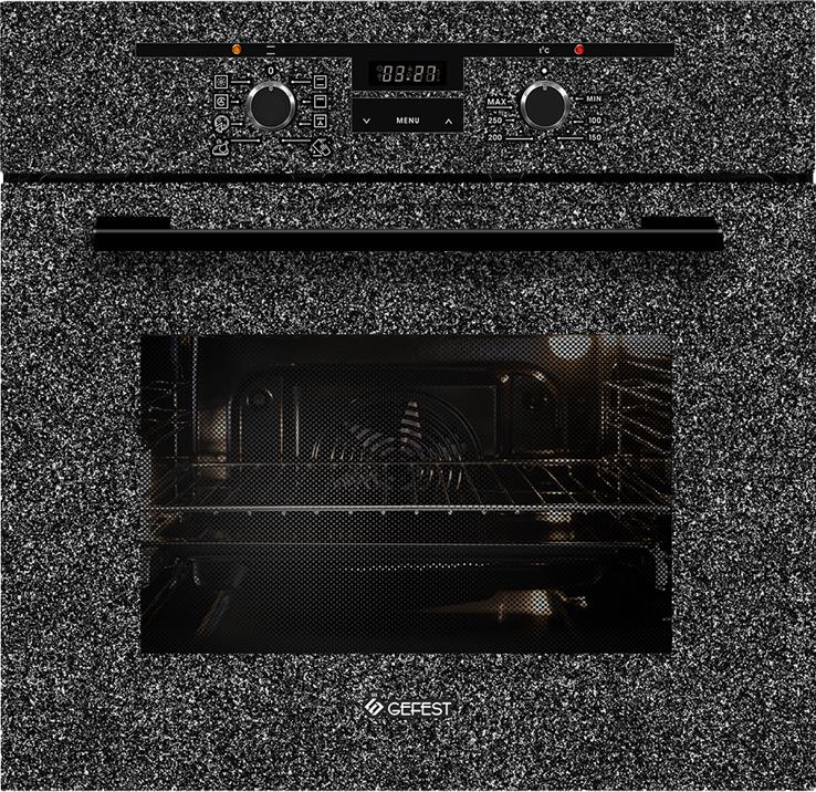Духовой шкаф. Цвет: черный с рисунком "камень". Габаритные размеры ШхГхВ: 59.8х56.5х59.5 см. Объём духовки: 55 л. Гриль электрический. Таймер сенсорный. Подсветка духовки двойная. Телескопические направляющие. Съемные проволочные направляющие духовки. Усиленный гриль с конвекцией. Класс электробезопасности: I.