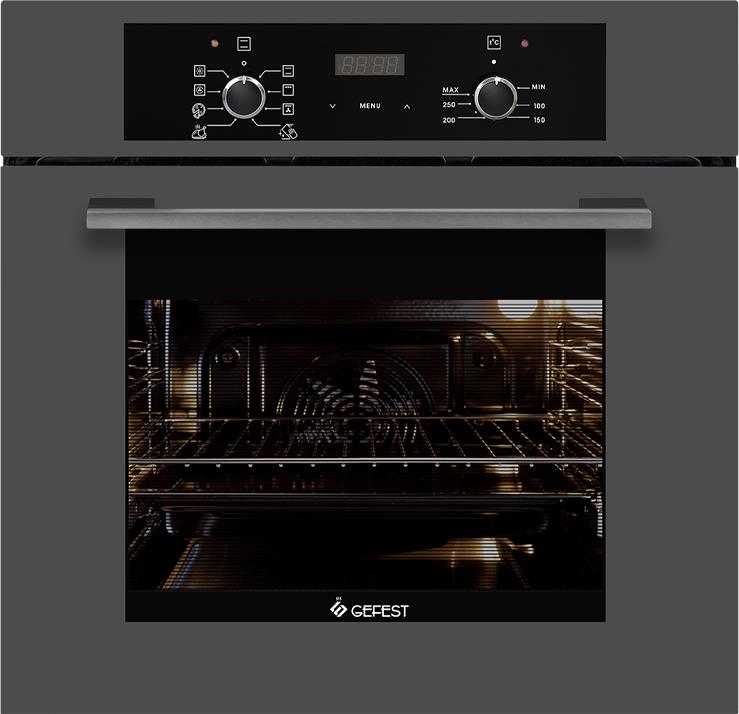 Духовой шкаф. Габаритные размеры ШхГхВ: 59.8х56.5х59.5 см. Цвет: серый. Объём духовки: 55 л. Таймер сенсорный. Гриль электрический. Телескопические направляющие. Подсветка духовки двойная. Усиленный гриль с конвекцией. Съемные проволочные направляющие духовки. Тип: электрическая. Фасад: стеклянный. Диапазон номинальных напряжений, В: 220230 Сетевой шнур и вилка: в наличии. Класс энергоэффективности: A .Класс электробезопасности: I.