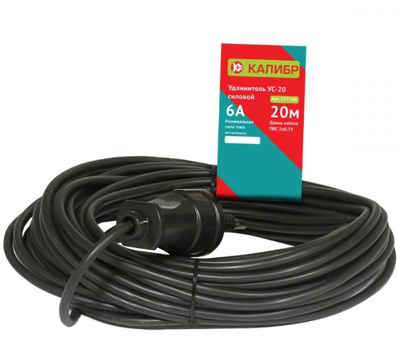 Удлинитель электрический Калибр УС20 силовой, предназначен для работы в сетях переменного тока напряжением 230±10%, ~50 Гц. При помощи удлинителя легко подключить удалённые от стационарной розетки электроприборы, имеющие шнур с плоской или круглой вилкой. Незаменим на стройке, садовом участке, в промышленности и в быту. Сечение 0,75 мм2. Максимальная нагрузка 6 А, 1300 Вт. Длина кабеля 20 м.