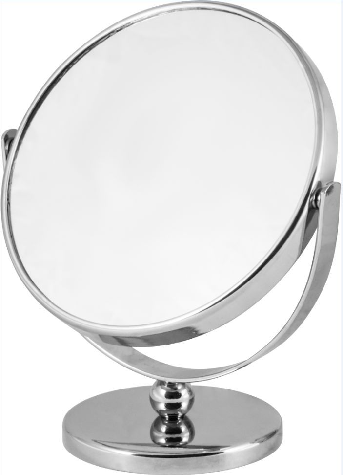 Зеркало косметическое двустороннее на ножке (1Х5) Диаметр: 12,5см Размер: 13,5*8*15 см Материал: хромированный металл, стекло С одной стороны обычное зеркало, с другой с 5кратным увеличением Упаковка: картонная коробка Двустороннее настольное зеркало отлично подойдет для нанесения макияжа и проведения процедур по уходу за кожей лица. У зеркала две поверхности, одна из которых дает обычное отражение, другая с 5 кратным увеличением.