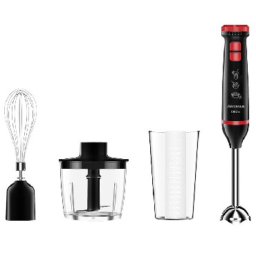 Номинальная потребляемая мощность 1000 Вт Объем чаши измельчителя 500 мл Объем мерного стакана 700 мл Блендер представляет собой многофункциональное устройство для смешивания, измельчения и взбивания продуктов и жидкостей в бытовых условиях Нож и насадки из нержавеющей стали Три сменных насадки: насадка для смешивания венчик для взбивания измельчитель Мерный стакан 5 скоростных режимов Режим «ТУРБО» Плавное переключение скоростей Цвет: черный с красным Производитель: Россия