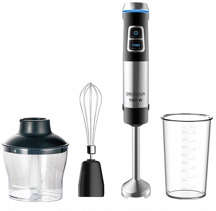 DELTA LUX DE7005B черный : 1500 Вт Параметры Максимальная мощность 1500 Вт Номинальная потреблямая мощность 1200 Вт Объем чаши измельчителя 600 мл Объем мерного стакана 800 мл Описание Блендер идеально подходит для приготовления суповпюре, соусов и подлив, детского питания, смешивания разнообразных коктейлей, измельчения продуктов в бытовых и аналогичных условиях Корпус из нержавеющей стали и гигиеничного пластика Цвет: черный LEDподсветка Насадки и нож из нержавеющей стали Три сменных насадки: насадка для измельчения и смешивания венчик для взбивания измельчитель с крышкой Мерный стакан Плавное переключение скоростей Режим «ТУРБО»