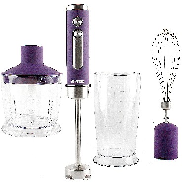 Блендер погружной. Мощность: 800 вт, Количество скоростей: 7, Турборежим, Плавная регулировка скорости, Управление: механическое, Материал корпуса: пластик, Материал погружной части: нержавеющая сталь, Емкость измельчителя: 500 мл, Емкость мерного стакана: 600 мл, Венчик для взбивания, Мерный стакан, Длина сетевого шнура: 120см, Измельчитель, Цвет: Фиолетовый