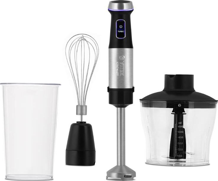 Блендер погружной. Мощность: 1250 вт, Количество скоростей: 24, Турборежим, Плавная регулировка скорости, Управление: механическое, Материал корпуса: пластик, Материал погружной части: нержавеющая сталь, Емкость измельчителя: 650 мл, Емкость мерного стакана: 800 мл, Венчик для взбивания, Длина сетевого шнура: 110см, Цвет: Черный/серебро.