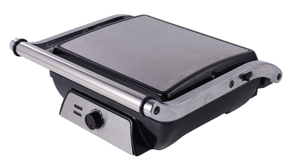 Гриль электрический, мощность 2000 Вт, регулируемый термостат (максимальная температура 240°С), 2 рифленые панели для жарки, размер панели 29,7х23,6 см, антипригарное покрытие, открытие панелей на 180° (возможность приготовления на 2 пластинах одновременно), индикатор работы, прорезиненные ножки. Корпус из нержавеющей стали и термостойкого пластика. Комплектация: резервуар для сбора масла.
