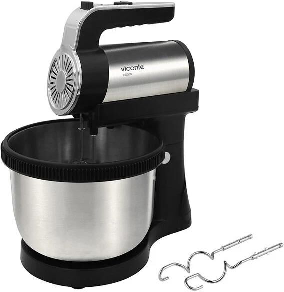 Миксер Viconte VC1343 1000 W, Миксер с чашей, 1000 W, 5 скоростей работы, металлическая вращающаяся чаша 4,0 л для смешивания, кнопка извлечения насадок, двойной набор насадок: два венчика для взбивания яиц и кремов, две насадки для размешивания тяжелого теста, смешивание жидкостей, замешивание теста, приготовление пюре, взбивание сливок и белков.