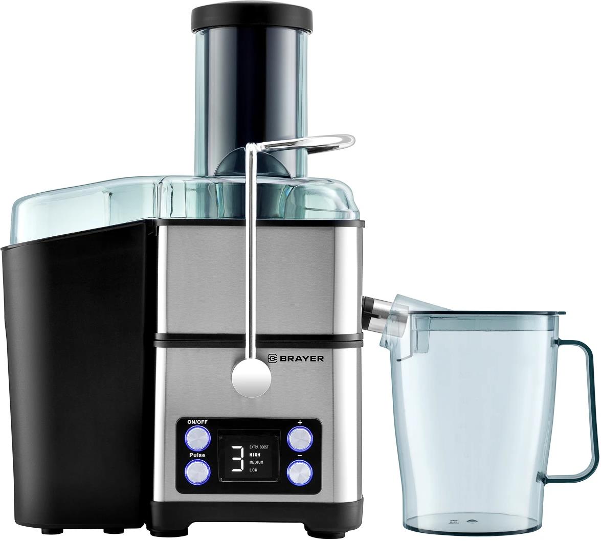 Центробежная соковыжималка Максимальная мощность 800 Вт LEDдисплей 4 скорости для мягких и твердых продуктов Импульсный режим Широкий желоб для целого плода 75 мм Корпус из нержавеющей стали Фильтр из нержавеющей стали Контейнер для мякоти объемом 2 л Контейнер для сока объемом 1,1 л Противокапельная система Прорезиненные ножки