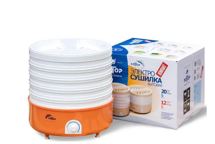 Сушилка для овощей и фруктов. 5реш складывающиеся (цветная упаковка). Мощность 520 Вт. Регулировка температуры от 20 до 70 °С. Особенность данной модели – складывающиеся решета. В зависимости от цели использования, при регулировании положений боковых рёбер, объём сушильной камеры может увеличиваться или уменьшаться. Рабочий объём сушильной камеры – 20 л., компактный объём – 12 л.