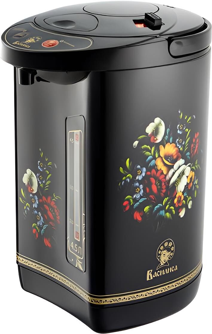 Объем 4,5 л. Мощность в режиме кипячения 900 Вт. Мощность в режиме поддержания температуры воды 30 Вт. Внутренняя ёмкость из нержавеющей стали. Вращение корпуса на основании на 360°. Шкала уровня воды. Световые индикаторы работы. 3 способа розлива воды: ручной. автоматический. электрический. Режим поддержания температуры воды. Функции повторного кипячения и дехлорирования воды. Съёмный сетевой шнур электропитания. Съёмная крышка для удобства очистки. Защита от перегрева. Блокировка ручной помпы от случайного нажатия. Автоматическое отключение при недостаточном количестве воды. Цвет: черный.