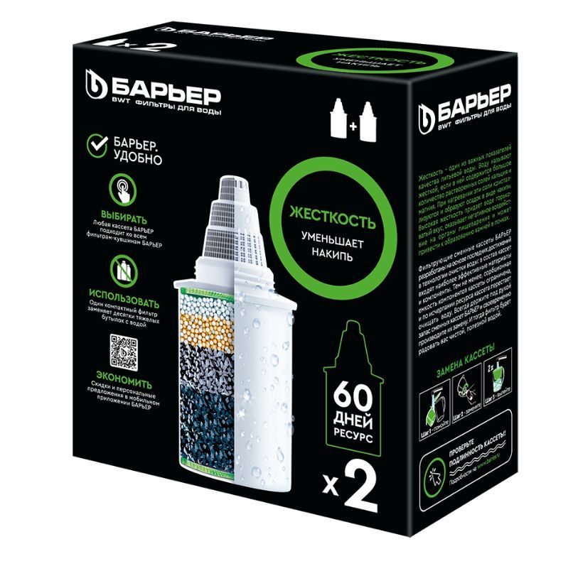 Количество в упаковке 2 Ресурс, л 350 Проблема воды Жесткая вода Тип очищаемой воды Питьевая водопроводная Срок хранения, мес 36 Размеры упаковки, ДхШхВ 129x64x146мм Срок хранения, мес 36 Вес, кг 0.285 Комплект из 2 сменных кассет для фильтра БАРЬЕР Жесткость Х2. Специализированная очистка очень жесткой городской воды. Улучшенный состав засыпки позволяет менять кассету реже и дольше наслаждаться водой без накипи. Как и другие кассеты БАРЬЕР, Жесткость Х2 также удаляет хлор и его побочные продукты, тяжелые металлы, посторонние запахи и привкусы. Ресурс каждой кассеты — 350 литров.