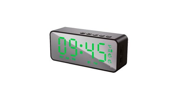 Светодиодный дисплей с высотой символов 1.1” (2.7 см) Регулируемая яркость дисплея (2 уровня) Кварцевый стабилизатор Два будильника Один режим работы будильника (сигнал) Формат времени 12/24 часа Bluetooth 5.0 FMтюнер (87.5 – 108 МГц) Выходная мощность: 3 Вт Поддержка TFкарт (до 32 ГБ) Воспроизведение формата MP3 Функция HandsFree Встроенный аккумулятор: 1200 мАч Питание от адаптера (в комплекте) Цвет: чёрный