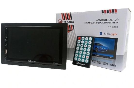 4*60W, Bluetooth, MirrorLink (поддержка Android и iOS), поддержка кнопок на руле, мультицвет, ISOразъем в комплекте, AUX. SD, USB Магнитола TAKARA HT3019 для вашего авто снабжена множеством функций, воспроизводит качественное видео изображение и великолепный звук с множеством настроек эквалайзера. Поддержка воспроизведения аудио, фото и видео Поддержка USB2.0/SDкарты Поддержка функции заднего вида автомобиля Поддержка Bluetooth Функция сопряжения с любым смартфоном Видео выход Поддержка управления рулевым колесом. Максимальная выходная мощность: 4*50 Вт Модуль Bluetooth 4.0 MirrorLink беспроводные технологии для воспроизведения контента, навигацию через смартфон Количество FM ячеек памяти: 18 Тип дисплея: сенсорный ЖК (TFT) Диагональ экрана: 7" Разрешение экрана: 800*400 Аудио форматы: FLAC, MP3, Wav, AAC Видео форматы: AVI, MKV, MP4, MPEG Графические форматы: JPG, BMP, PNG BT/FM/USB/SD/AUX RCAразъемы LOUT, ROUT, VOUT1, VOUT2, CVBS IN, CAM IN размеры: 177*120*62*. Рамка 190
