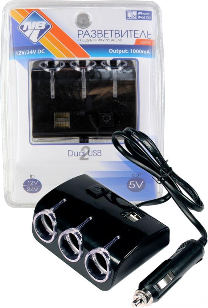NOVA BRIGHT электропитания от прикуривателя 3 гнезда + 2 USBпорта, 1000мА, 12/24В 46902