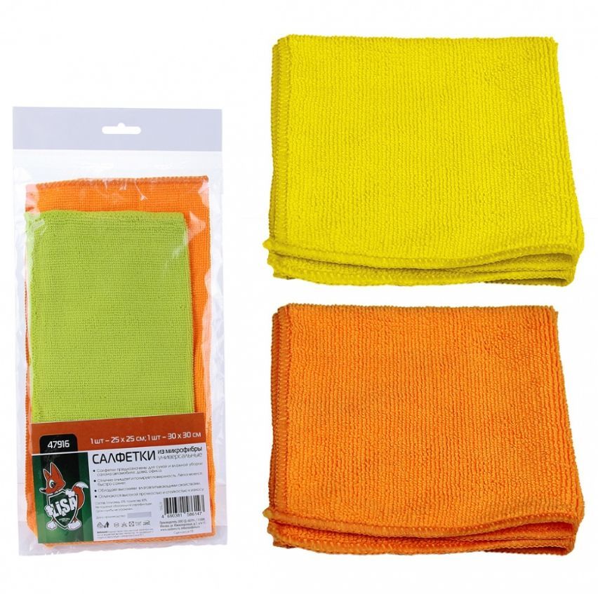 Салфетки из микроволоконной ткани предназначены для сухой и влажной уборки салона автомобиля и дома. Не оставляют разводов, безопасны для любых покрытий. Отлично чистят, легко моются и быстро сохнут. Состав: полиамид 20%, полиэстер 80%.В комплекте 2 салфетки из микрофибры: 1 штука 25х25 см; 1 штука 30х30 см.
