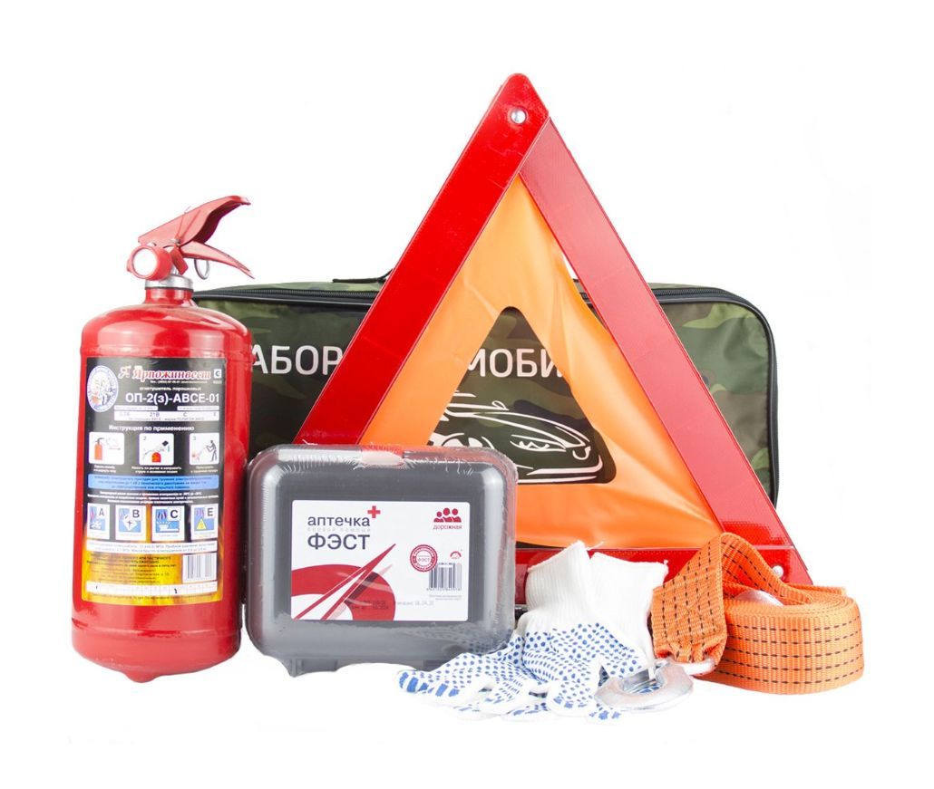 Набор автомобилиста необходим в каждом автомобиле. Содержит компоненты соответствующие Федеральному закону "О техническом осмотре транспортных средств". Предмет первой необходимости в случае ДТП. В комплекте: огнетушитель порошковый ОП2; знак аварийной остановки в футляре; аптечка; трос буксировочный из полипропилена 4,8 м/5т; перчатки х/б с напылением.