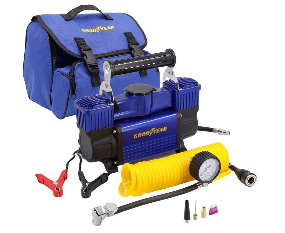 Воздушный компрессор Goodyear GY80L 80 л/мин, двухпоршневой, питание от АКБ, съемный витой шланг, сумка для хранения Устройство отлично справляется с накачиванием колес джипов, внедорожников, минивэнов, микроавтобусов и небольших грузовиков, а также надувных лодок. В комплект входит набор переходников. Производительный компрессор питается от клемм аккумулятора 12В. Он может беспрерывно работать в течение 30 минут, а с колесом R16 справляется за 2 минуты. Модель GY80L оснащена съемным витым шлангом, на конце которого расположен коннектор к ниппелю колеса в виде удобной металлической защелки. За счет этого процесс присоединения компрессора становится практически мгновенным и не требует усилий. Двухпоршневой компрессор поставляется в прочной сумке, что позволяет компактно хранить инструмент в багажнике автомобиля. " Вес: 3,8 кг " Длина провода питания: 3 м " Длина витого шланга: 5 " Габариты ДхШхВ: 290х195х220 мм