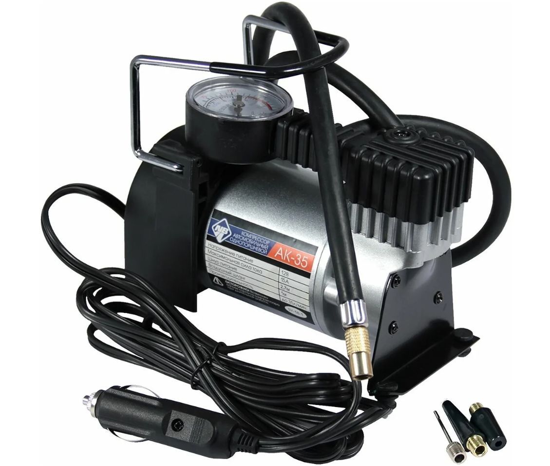 Мощность – 150 Вт. Максимальная сила тока – 15 А. Максимальное давление – до 10 кг/см2 (140PSI/10Bar) Производительность – до 35 л/мин. Шнур питания – 2,7 м. Воздушный шланг – 1м. Пластиковый кейс Питание от гнезда прикуривателя Встроенный в штекер питания предохранитель Комплект насадокпереходников – 3 шт. Цвет серебро Напряжение питания — 12В. Состав: металл, пластик