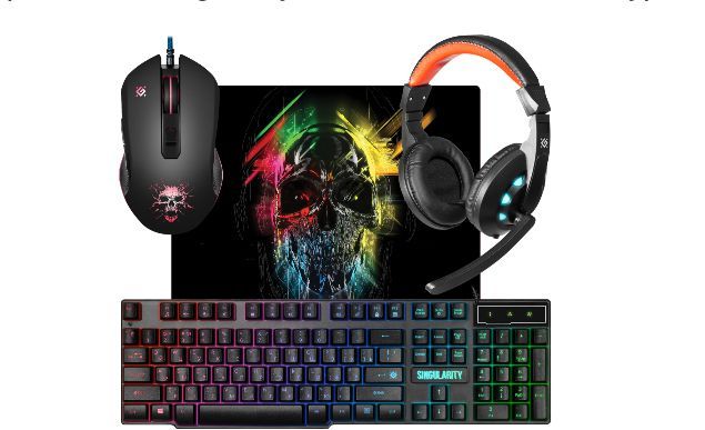 Игровой набор 4в одном (гарнитура+клавиатура+мышь+коврик) проводной, интерфейс USB, гарнитура импеданс (наушники) 32 Ом, импеданс (микрофон) 2.2 кОм,чувствительность (наушники) 110±3 дБ, чувствительность (микрофон) 42±3 дБ, частотный диапазон (наушники) 20–20000 Гц, длина кабеля 1.8 м; клавиатура количество клавиш 104, увеличенная площадь клавиш, радужная подсветка; мышь оптическая, количество кнопок 5, колесо прокрутки, изменяемое разрешение 800/1800/2400/3200 dpi, прорезиненное покрытие, переливающаяся подсветка; коврик материал термически обработанная ткань + натуральная резина, поверхность Speed, размер 280*230*3 мм.