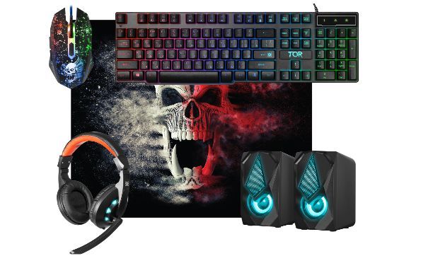 Игровой набор (5 в одном) клавиатура+мышь+гарнитура+ акустика+ коврик, проводной, интерфейс USB; клавиатура мембранная, количество клавиш 104, длина кабеля 1,5 м; мышь оптическая, количество кнопок 5 + колесокнопка изменяемое разрешение 800/1800/2400/3200 dpi; гарнитура импеданс (наушники) 32 Ом, чувствительность наушники/микрофон 110±3 дБ/42±3 дБ, частотный диапазон наушники 20–20000 Гц, длина кабеля 1.8 м; акустика Суммарная выходная мощность (RMS) 6 Вт, диапазон частот 90–20000, тип интерфейса 3,5мм джек; коврик размер 280*230*3, материал термически обработанная ткань + натуральная резина, поверхность Speed.