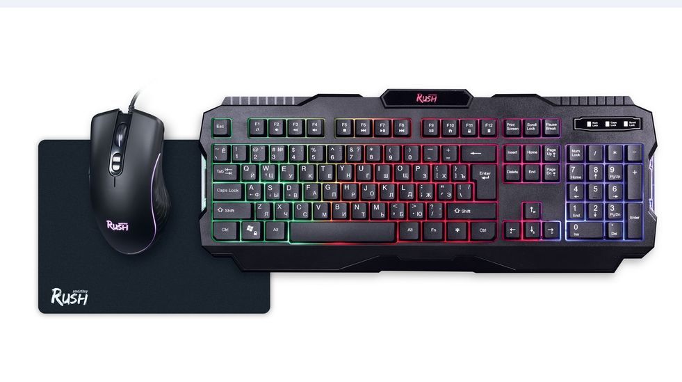 Набор игровой 3 в 1 (клавиатура+мышь+коврик), проводной, клавиатура : количество клавиш 104, горячих клавиш для быстрого доступа 12, одновременное нажатие до 19 клавиш; многоцветная подсветка клавиш; USBкабель в текстильной оплетке; длина 1,5 м. ; мышь: проводная оптическая, количество кнопок 7, изменяемое разрешение 1200/1600/2400/3200 dpi, коврик: обработанная ткань, нескользящая каучуковая основа, размер 300*213*2 мм.