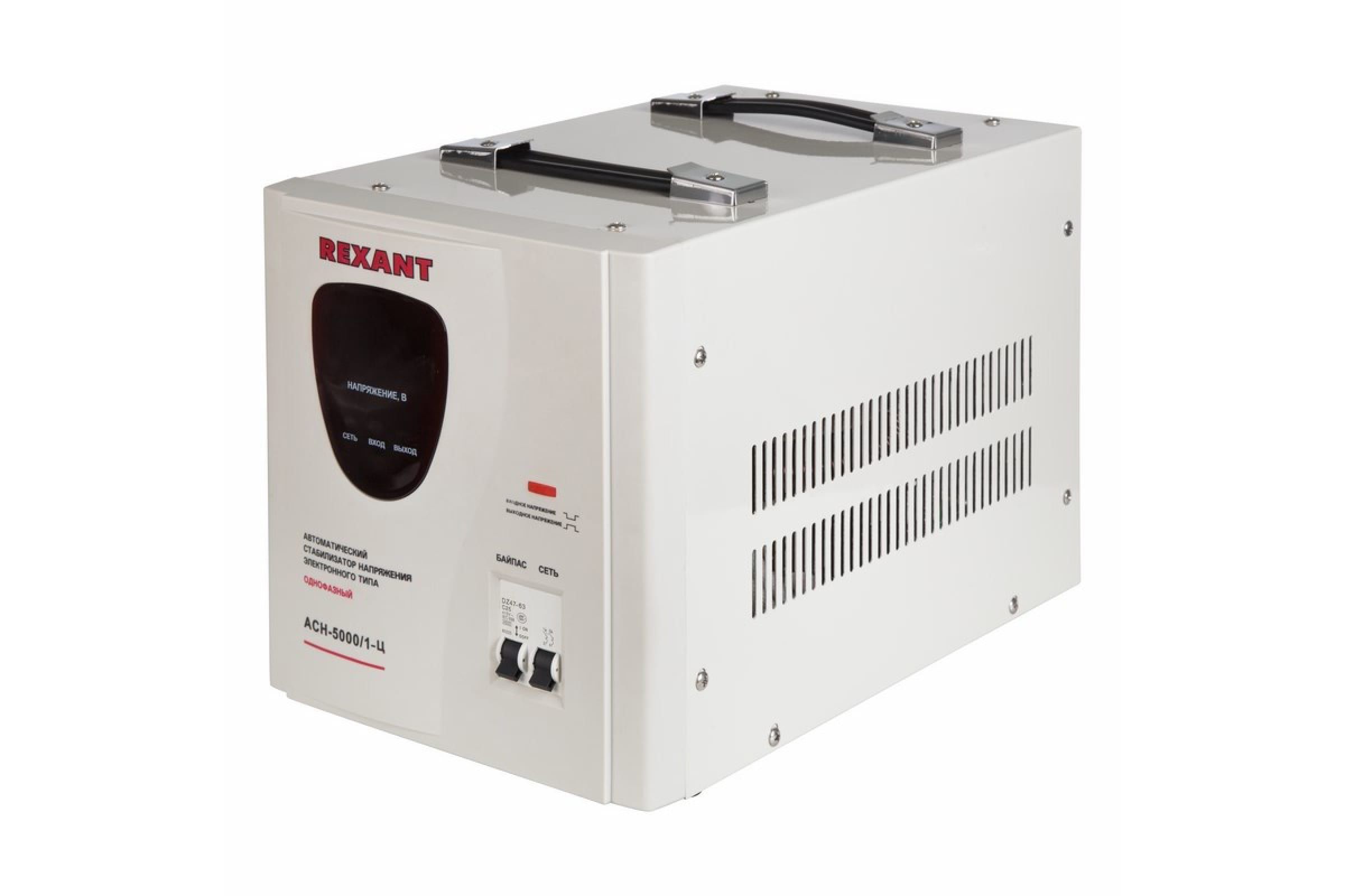 Однофазный стабилизатор REXANT для дома и офиса. Защищает бытовую технику от перепадов в сети и короткого замыкания. Преимущества: Широкий рабочий диапазон входного напряжения. Осуществление стабилизации тока с высокой степенью точности. Высокая скорость реакции. Небольшие размеры, это обусловлено отсутствием мех элементов. Релефункционируют очень долго и тем самым продлевают срок годности стабилизатора. Он может составлять до 7 лет. Харки Диапазон входного напряжения, В 140260 Номинальная величина выходного напряжения, В 220±8% Номинальная мощность при Uвх?190 В (кВт) 5 Рабочая частота (Гц) 50 / 60 КПД, при нагрузке 80% не менее 97 Точность поддержания выходного напряжения (%) 8 Масса нетто (кг) 13 Охлаждение естественное Время регулирования (мс) 57 Искажение синусоиды отсутствует Высоковольтная защита (В) 260±5 Класс защиты IP 20 (негерметизирован) Рабочая темп окружающей среды (оС) 045 Относительная влажность воздуха, не более (%) 80