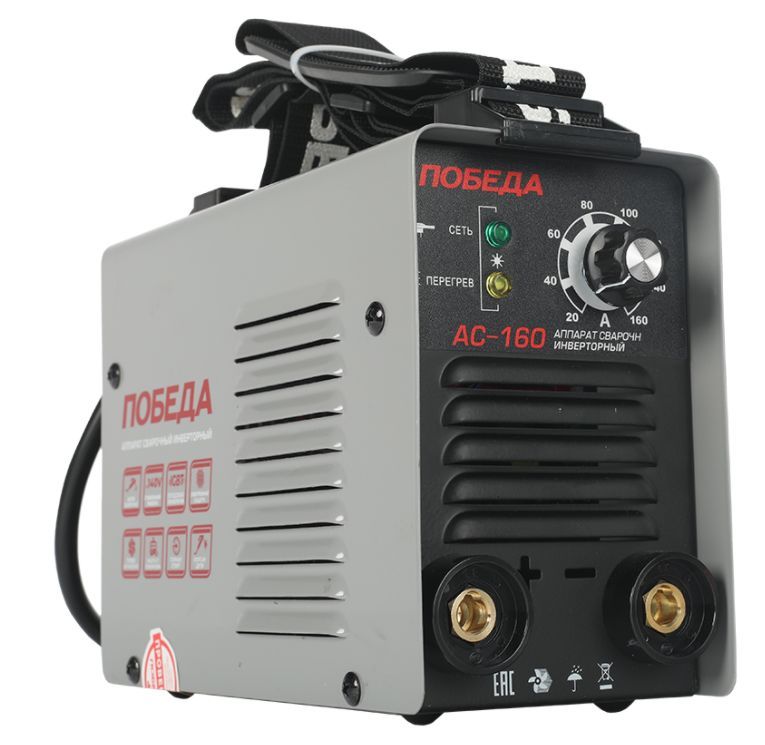 Сварочный аппарат инверторный, входное напряжение 1ф 220В, потребляемая мощность 3.9 кВА, сварочный ток мин/макс 20/160А, ПВ60%, диаметр электрода 1.6/4 мм, комплектация: держатель электрода, клеммаземля. Функция антизалипания, горячий старт, жесткость дуги. Ремень для переноски. Вес 4.6 кг.