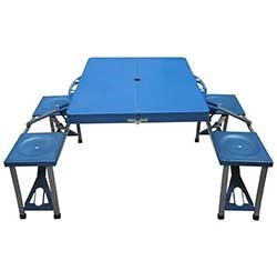Стол складной со скамейками в чемодане TD12 Складывается в чемоданчик с ручками для хранения и переноски. Есть отверстие для установки зонта. Максимальная нагрузка на стул 80 кг Максимальная нагрузка на стол 30 кг Размеры: стол 84*63,566, стул 30*27*40 Размеры в сложеном виде: 86*10,5*39 Цвет синий Материал: пластмасса, алюминий