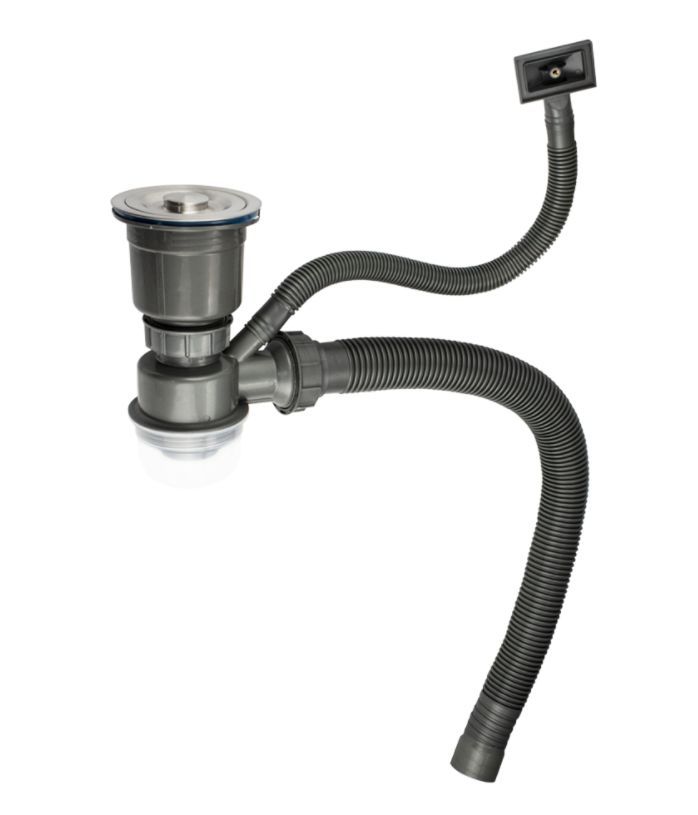 Сифон для кухонных моек, цвет хром, матовый, с диаметром сливного отверстия 90 мм, бутылочного типа с переливом и со сьёмной корзинкой для мусора. С разборным выпуском и нержавеющей решеткой с гофрой, из высокопрочного пластика АБС с затвором от проникновения запахов. Форма сифона позволяет поддерживать хорошую пропускную способность слива сточной воды, выполняя свою главную функцию формирование гидрозатвора для отсечения неприятных запахов из канализации. Конструкция позволяет легко, без демонтажа, снять отстойник (стакан) и почистить сифон в случае засорения, достать случайно упавшие в слив раковины мелкие ценные вещи. Сифон прост в установке. Габаритные размеры: высота стакана 220 мм, гофра 650 мм, верхняя крышка 110 мм. Комплект: сифон, гофра, перелив, уплотнения. Вес 0,500 кг, объём 0,01080 м3.