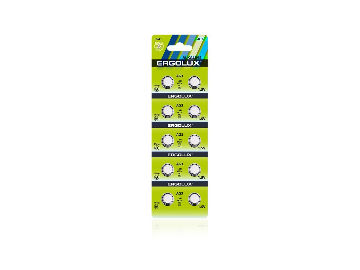 Батарейка Ergolux AG3BP10, напряжение 1,5В, емкость 28мА*ч, колво в упаковке 10 шт., использовать при температуре от 18 до +55 °C, хранить при температуре от + 15 до + 25 °C. Срок хранения 5 лет.