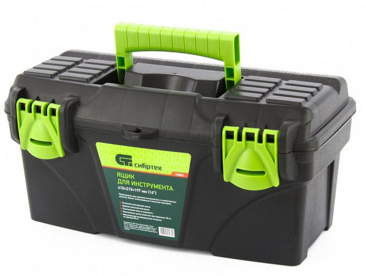 СИБРТЕХ Ящик для инструмента 16" 410х215х197 мм, пластик 90804 Материал полипропилен Габариты 410 x 215 x 197 мм Особенности наличие лотка Ящики для инструмента СИБРТЕХ — это современный внешний вид, стильное цветовое решение и необычная шагреневая фактура пластика, приятная на ощупь. Многочисленные ребра жесткости придают корпусу дополнительную прочность, благодаря чему ящик устойчив к падениям на твердые поверхности и выдерживает нагрузку до 100 кг. Ящик оборудован эргономичной ручкой для переноски, а петли крышки и ручки выдерживают его загрузку до 50 кг. С помощью трехрядных петель усилена конструкция замков и верхней крышки. Также, у ящиков СИБРТЕХ продумано внутреннее пространство: для хранения мелких деталей и небольшого инструмента имеется пластиковый вкладыш с ручкой. На корпусе крышки всех моделей нанесена линейка в дюймах и сантиметрах, что позволяет оперативно делать необходимые замеры.