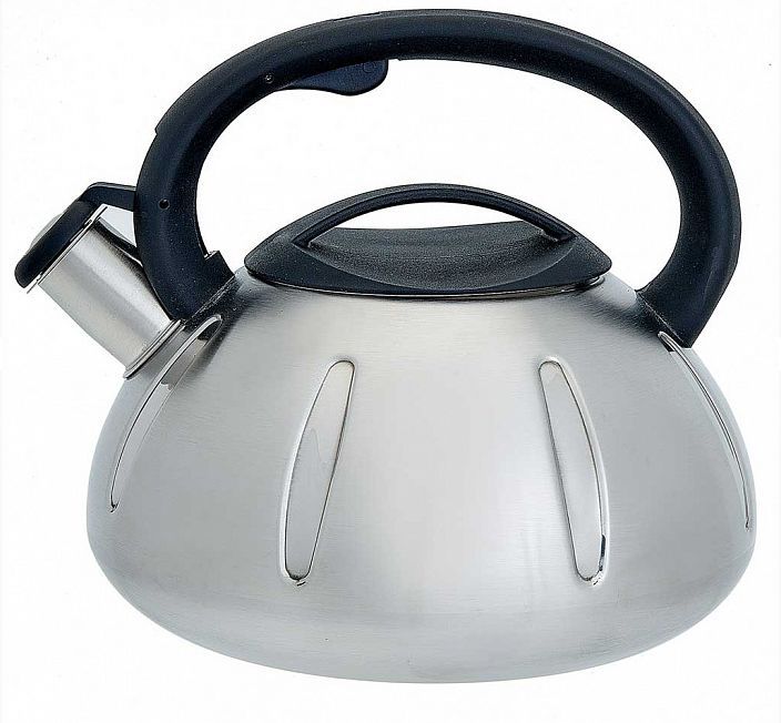 WEBBER BE0569/1 Объем 3 л., Толщина стенок 0,6 мм. Чайник из нержавеющей стали со свистком. Высококачественная нержавеющая сталь. Матовая сатиновая полировка. Индукционное дно. Нейлоновая ручка с кнопкой открывания носика. Цвет ручки и крышки: черный. Пригоден для использования на всех типах кухонных плит, включая индукционные.