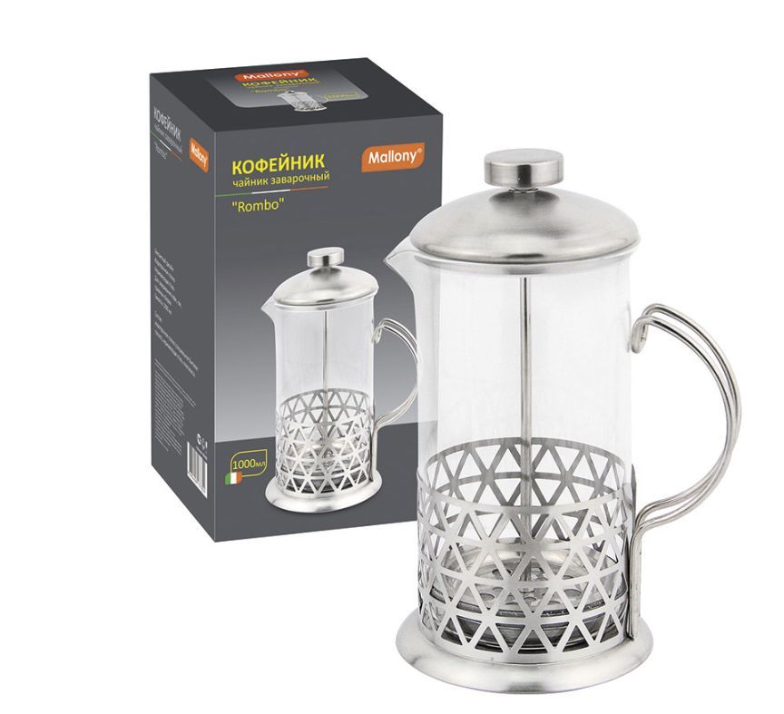 Кофепресс/чайник заварочный серия Rombo, объем 1000 мл, тм Mallony Предназначен для заваривания чая, кофе, прочих напитков. Коэффициент линейного расширения — 3,0. Корпус/фильтр/стержень из нержавеющей стали № 201, колба из жаропрочного боросиликатного стекла. Крышка — нерж сталь № 201/пластмасса. Толщина стекла — 0,8 мм Толщина нерж стали — 0,3 мм Можно мыть только стекл колбу в посудомоечной машине, остальные части не рекомендуется мыть в посудомоечной машине (можно мыть мягким моющим средством и теплой водой, хорошо просушивать). Упаковка: цветная картонная коробка.