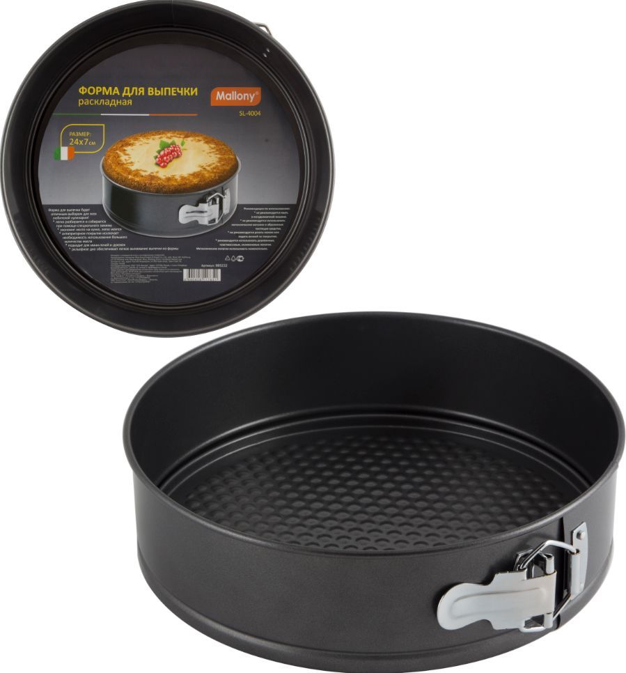 Размер: 24*7 см Толщина стали 0,4 мм Цвет серый Материал: углеродистая сталь Круглая форма для выпечки будет отличным выбором для всех любителей домашней выпечки. * легко разбирается и собирается при помощи специального зажима * экономит место на кухне * легко моется * антипригарное покрытие исключает необходимость использования большого количества масла * подходит для мини печей и духовок * рельефное дно обеспечивает легкое вынимание выпечки из формы Упаковка: Цветной вкладыш и термоусадка