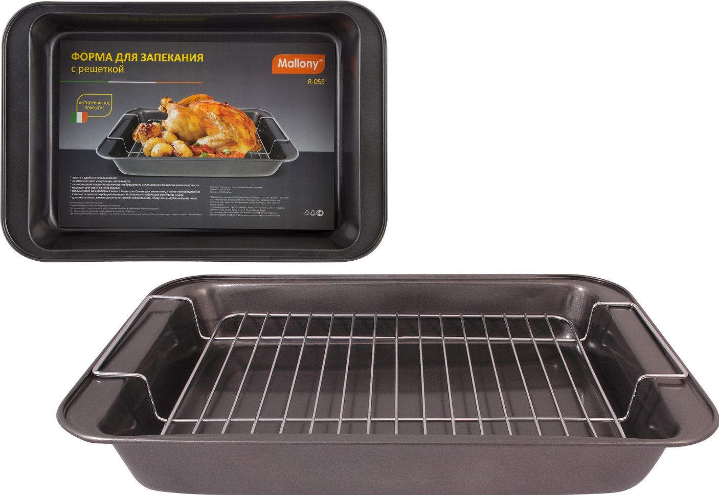Размер: 37,5*25,5*5 см размер решетки: 21*35 см Толщина стали 0,4 мм Расстояние между прутьями решетки 2 см Материал: углеродистая сталь с антипригарным покрытием * проста и удобна в использовании * не изменяет цвет и вкус пищи * легко моется * антипригарное покрытие исключает необходимость использования большого количества масла * подходит для мини печей и духовок * используются для запекания пищи в фольге, на бумаге для выпекания, а так же непосредственно в форме (в данном случае рекомендуем использовать небольшое колво масла) Упаковка: цветной вкладыш + термоусадка