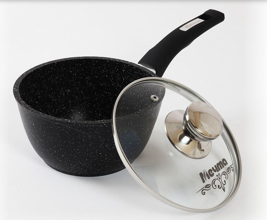 Ковш 1.2л. с несъемной ручкой из бекелита и стеклянной крышкой Антипригарное покрытие Greblon на водной основе без PFOA. Серия "Гранит black". Подходит для всех типов плит, кроме индукционных. Можно использовать в посудомоечной машине. Ресурс более 12 000 циклов, толщина покрытия до 55 мкр. Толщина дна 8мм., толщина стенок 3,64мм. Покрытие Greblon позволяет готовить с минимальным количеством масла, сохраняя вкусовые и полезные свойства продуктов. Литой толстостенный корпус не подвержен деформации, а утолщенное дно равномерно распределяет тепло по всей поверхности.