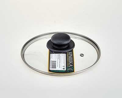 Крышка изготовлена из термостойкого стекла. снабжена пароотводом и имеет металлический обод. Пластиковая ручка на крышке не нагревается, имеет эргономичную форму и не скользит в руке. Можно мыть в посудомоечной машине. Очень удобна в использовании, т.к. позволяет контролировать процесс приготовления пищи не открывая сковородку или кастрюлю. Диаметр 20 см.