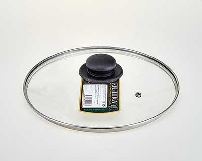 Крышка изготовлена из термостойкого стекла. снабжена пароотводом и имеет металлический обод. Пластиковая ручка на крышке не нагревается, имеет эргономичную форму и не скользит в руке. Можно мыть в посудомоечной машине. Очень удобна в использовании, т.к. позволяет контролировать процесс приготовления пищи не открывая сковородку или кастрюлю. Диаметр 26 см.