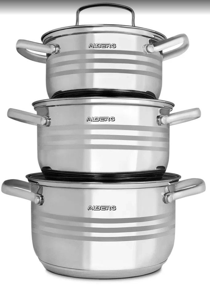 Набор состоит из 6 предметов: 3 кастрюли, 3 крышки Кастрюля 2 л (16 х 10,5 см) Кастрюля 3 л (18 х 11,5 см) Кастрюля 4 л (20 х 12,5 см) Мерная шкала в каждой кастрюле Толщина стенок 0.5 мм Высококачественная нержавеющая сталь 7ми слойное капсульное индукционное дно Крышки из жаропрочного стекла с отверстием для выхода пара Подходит для всех видов плит, включая индукционные Нельзя использовать в духовом шкафу Подходит для мойки в посудомоечной машине