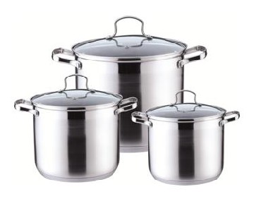 Набор из 6 предметов; Кастрюля с жаропрочной стеклянной крышкой 2,1л; Кастрюля с жаропрочной стеклянной крышкой 3л; Кастрюля с жаропрочной стеклянной крышкой 4л; Диаметр изделий составляет: 20 см, 18 см, 16 см; Высококачественная нержавеющая сталь 18/10; 5ти слойное капсульное дно; Мерная шкала внутри; Не нагревающиеся клепаные ручки; Подходит для всех видов плит, включая индукционные; Можно мыть в посудомоечной машине.
