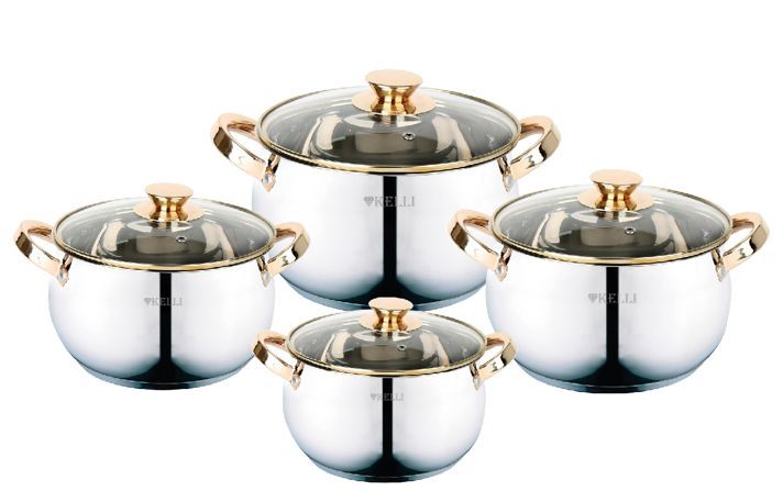 Набор из 8 предметов; Кастрюля 2,1л, диаметр крышки 16см; Кастрюля 3л, диаметр крышки 18см; Кастрюля 4л, диаметр крышки 20см; Кастрюля 6,2л, диаметр крышки 24см; Высококачественная нержавеющая сталь 18/10; Жаропрочные стеклянные крышки с паровыпуском; 5ти слойное капсульное дно; Удобные термостойкие клепаные ручки; Подходит для всех видов кухонных плит.