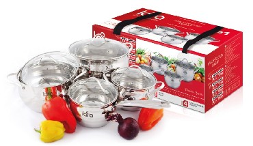 Высококачественная нержавеющая сталь Комбинированная полировка Многослойное термоаккумулирующее капсулированное дно Крышка из жаропрочного стекла Удобные ручки из высококачественной стали Экологически чистые материалы Подходит для использования на газовых, чугунных, стеклокерамических, галогеновых, индукционных конфорках Набор состоит из 8 предметов: 3 кастрюли 1 сотейник 4 крышки