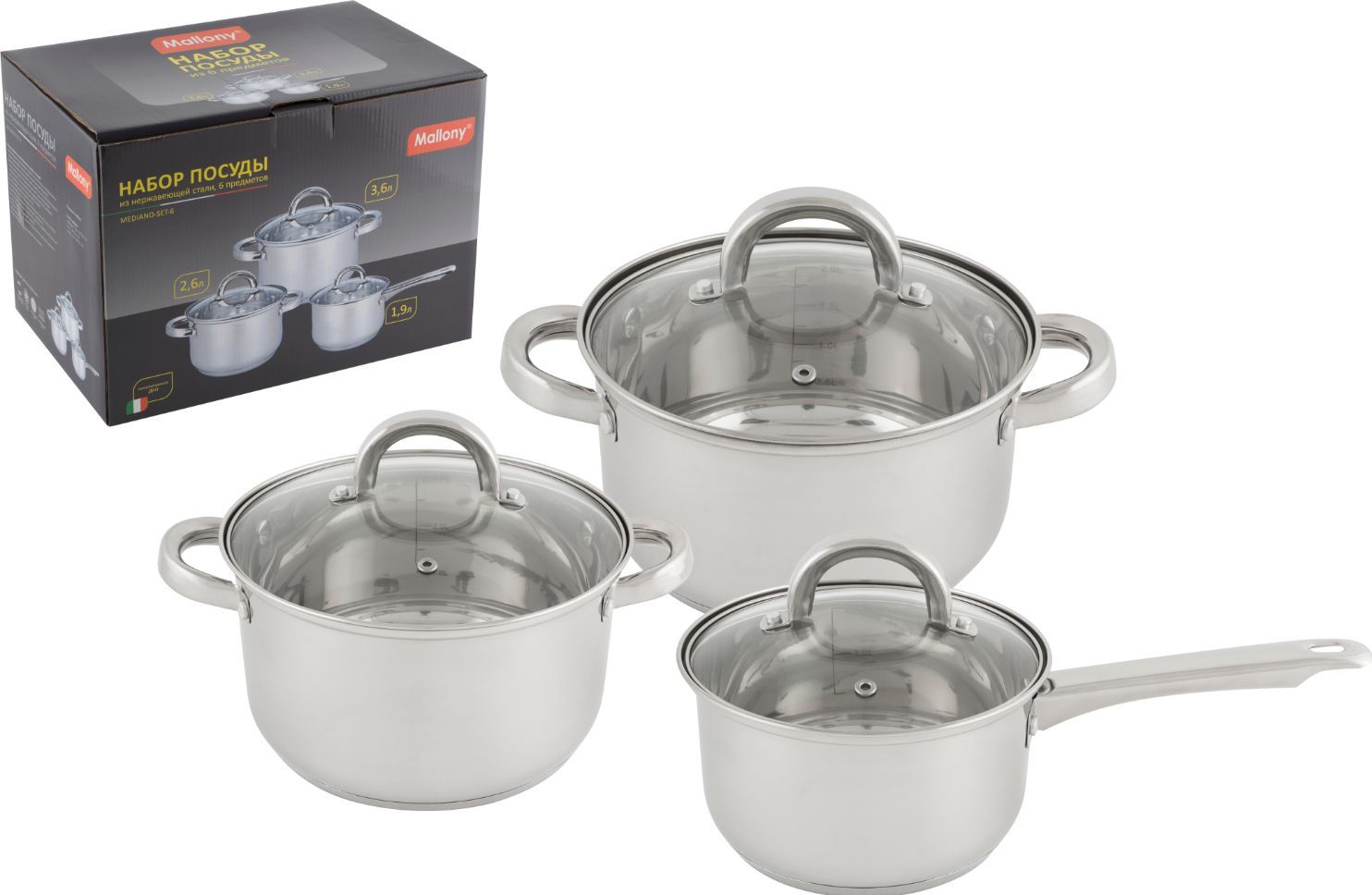 Набор посуды из нерж стали из 6 предметов, MEDIANOSET6 (ковш1,9л/кастрюли 2,6 и 3,6 л), тм Mallony Высота стенок без крышек ковш 9,5 см, кастрюля 2,6 л 10,5 см, кастрюля 3,6 л 11,5 см. Ковш с крышкой 16*9,5 см размер, литраж 1,9 л + Кастрюля с крышкой 18*10,5 см размер, литраж 2,6 л + Кастрюля с крышкой 20*11,5 см размер, литраж 3,6 л. 201 нержавеющая сталь, толщина 0,35 мм, дно 3слойное капсулированное 201 нерж сталь+ 1мм алюминия + 430 сталь, подходит для индукции, снаружи и внутри зеркальная полировка, отметки литража; полые ручки из нерж стали, Стип крышка из жаропрочного стекла с отверстием для выпуска пара. Не рекомендуется мыть в посудомоечной машине Упаковка цветная коробка.