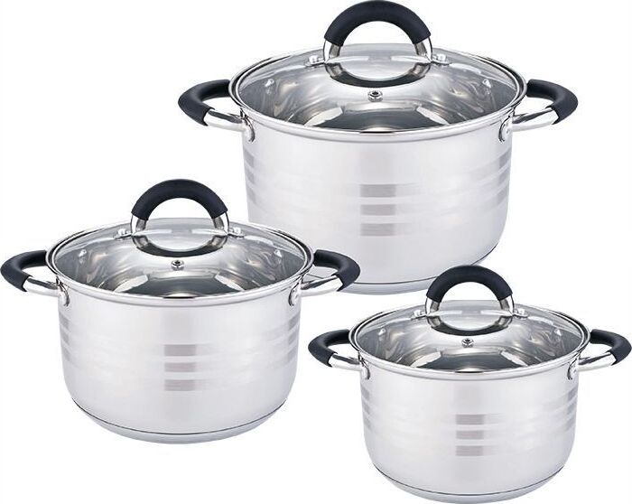 WEBBER BE623/6 Набор посуды из нерж.стали 6 пр. 2,2л, 3,0л, 4,0л со стеклянными крышками В наборе 6 предметов: кастрюля со стеклянной крышкой 16х10,5см; 2,2л кастрюля со стеклянной крышкой 18х11,5см; 3,0л кастрюля со стеклянной крышкой 20х12,5см; 4,0л Толщина стали 0,5 мм Описание Набор кастрюль из высококачественной нержавеющей стали со стеклянными крышками Специальная форма, исключающая скопление остатков пищи и жира Обод, препятствующий переливанию жидкостей через край Термостойкое силиконовое покрытие ручек Термосберегающее дно: пятислойное дно с повышенной термоотдачей Быстрый нагрев пищи, длительное удержание тепла Минимальные потери минеральных веществ, витаминов и вкусовых качеств Подходит для использования на всех типах кухонных плит, включая индукционные Подходит для мытья в посудомоечной машине