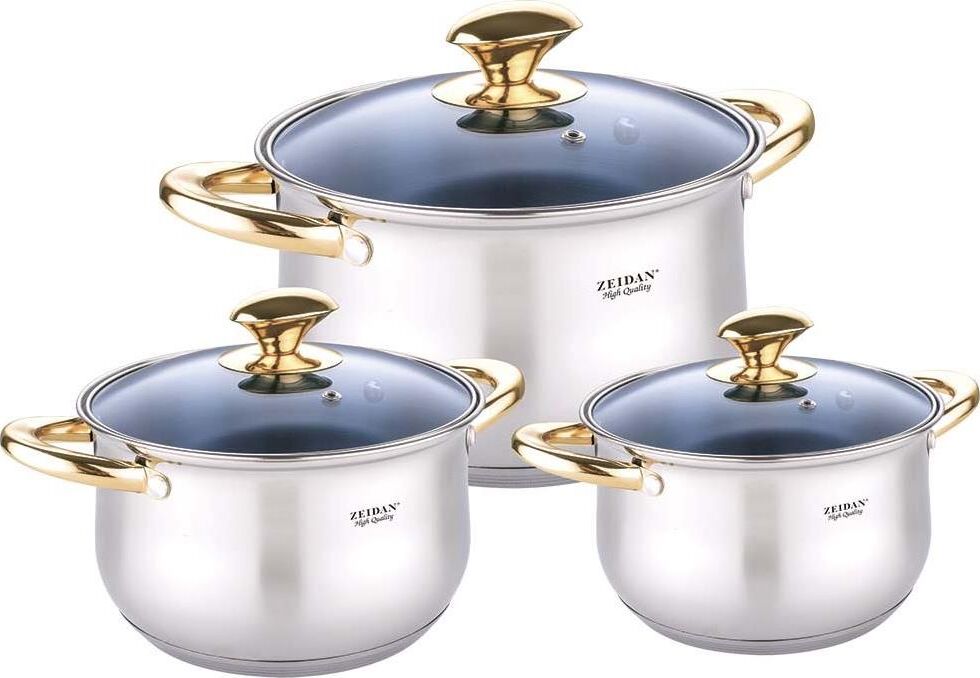 Набор посуды ZEIDAN Z50644 6 предметов, Набор кастрюль, 6 предм. (3 КАСТРЮЛИ С КРЫШКАМИ: 3,0 Л (d18 см ), 4,0 Л (d20 см ), 6,1 Л (d24 см ), нержавеющая сталь, 3x СЛОЙНОЕ КАПСУЛИРОВАННОЕ ИНДУКЦИОННОЕ ДНО, цветная стеклянная крышка с ручкой "ПОД ЗОЛОТО", ручки на корпусе "ПОД ЗОЛОТО", зеркальная полировка снаружи, матовая полировка внутри, шкала литража. Подарочная упаковка с ручкой.