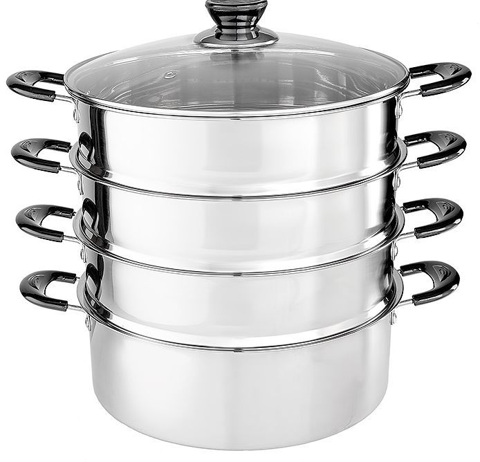 WEBBER BE083 Параметры В наборе 5 предметов: кастрюля для воды O26х12,5см; 8л, из нержавеющей стали 1 штука крышка O26см стеклянная 1 штука паровая емкость O26х7,5см, из нержавеющей стали, съемная, с сетчатым дном 3 штуки Толщина стали 0,5 мм Описание Мантоваркапароварка 4х уровневая Высококачественная нержавеющая сталь. Индукционное дно. Прозрачная стеклянная крышка позволяет следить за приготовлением пищи. Благодаря особому дизайну крышки пар, образующийся в процессе приготовления, собирается в центре крышки и, конденсируясь, капает на дно мантоварки. Термостойкие бакелитовые ручки. Специальная форма, исключающая скопление остатков пищи и жира. Обод, препятствующий переливанию жидкостей через край. Быстрый нагрев пищи, длительное удержание тепла. Минимальные потери минеральных веществ, витаминов и вкусовых качеств. Пригодна для использования на всех типах кухонных плит, включая индукционные. Подходит для мытья в посудомоечной машине.