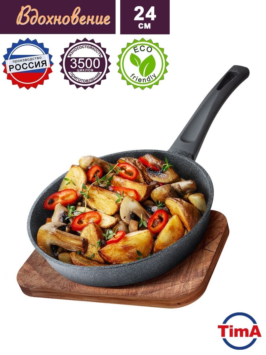 Сковороды изготовлены из пищевого алюминия современным методом литья с кристаллизацией под давлением и покрыты усиленным двухслойным антипригарным покрытием «Greblon Non Stick C2+» (Германия) толщиной около 30 мкм. Это покрытие выдерживает не менее 3,5 тысячи условных циклов приготовления пищи, что позволяет сковороде прослужить несколько лет. Увеличенная толщина дна (до 5 мм) и высокие стенки (55 – 65 мм) сковород позволяют не только жарить или разогревать различные блюда, но и тушить. Фиксированные эргономичные ручки с покрытием Softtouch, не нагреваются. Сковороды серии «Вдохновение» изготовлены в современном дизайне, имитирующем камень, оригинально и стильно смотрятся в интерьере любой кухни.