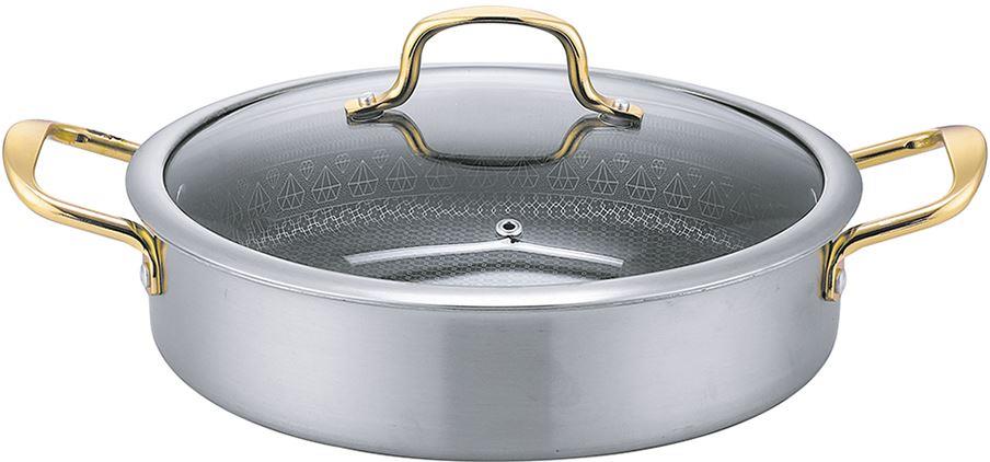 Жаровня с крышкой Z90256 d24x6 см Allegro, Жаровня с крышкой d24x6 см, высококачественная нержавеющая сталь, 3Х СЛОЙНЫЙ КОРПУС, ИНДУКЦИОННОЕ ДНО, ИННОВАЦИОННОЕ АНТИПРИГАРНОЕ ПОКРЫТИЕ С ЗАЩИТНОЙ СЕТКОЙ, крышка стекло с металлическим кантом, металлические ручки «под золото», подарочная упаковка с пластиковой ручкой.