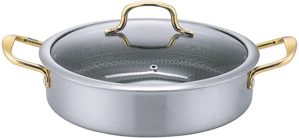 Жаровня с крышкой Z90257 d26x7 см Allegro, Allegro Жаровня с крышкой d26x7 см, высококачественная нержавеющая сталь, 3Х СЛОЙНЫЙ КОРПУС, ИНДУКЦИОННОЕ ДНО, ИННОВАЦИОННОЕ АНТИПРИГАРНОЕ ПОКРЫТИЕ С ЗАЩИТНОЙ СЕТКОЙ, крышка стекло с металлическим кантом, металлические ручки «под золото», подарочная упаковка с пластиковой ручкой.
