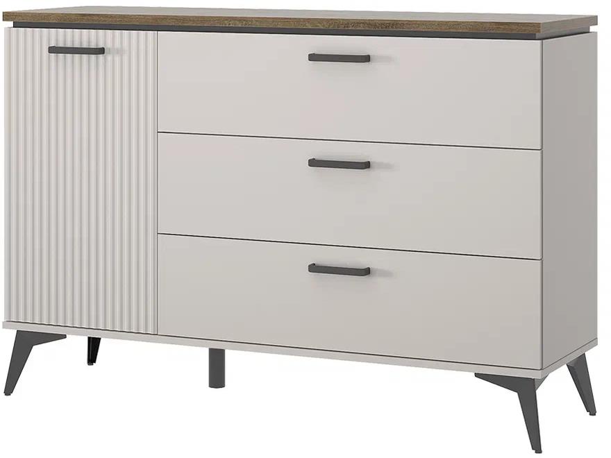 Нарядный и роскошный дизайн современной коллекции VINATI организация гостиной, спальной группы и молодёжной комнаты. Особенностью коллекции является оригинальный внешний вид, который выделяется фрезеровкой на фасадах, планками в чёрном цвете и металлическими опорами; использование петель с доводчиками, широкий выбор позиций для оформления интерьера. Тумба 1D3S универсальный предмет мебели. Подходит для оформления любой по функционалу комнаты, например, как отдельные элементы мебели в спальне, прихожей, молодёжной, коридоре, столовой и т.д.