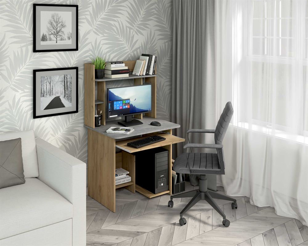 Небольшой компьютерный стол для учебы или работы, который благодаря скромным размерам можно разместить практически в любой месте. Стол имеет удобные полочки для хранения книг, дисков и прочих мелочей, а также, место под системный блок и выдвижную полку под клавиатуру. Размеры: ВхГхШ (1380х630х800)мм. Материалы: ЛДСП.
